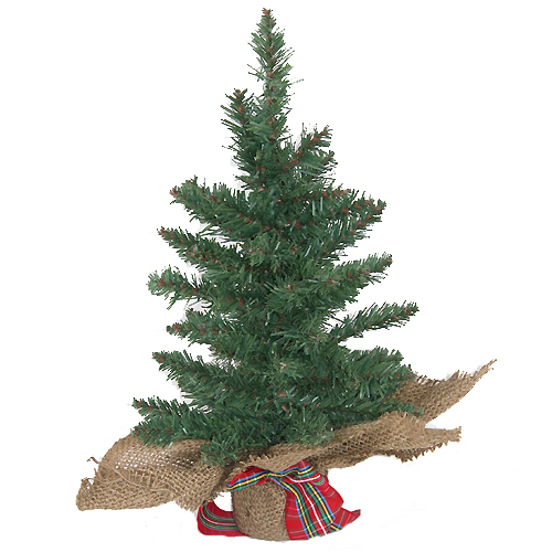 This darling little miniature tree has its base wrapped in natural burlap that has been tied with a pretty plaid ribbon.