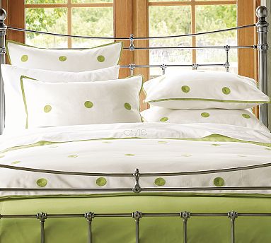 For our organic-cotton bedding, we’ve chosen over sized dots, crewel-stitched by hand in vibrant hues that complement our sheeting programs. Expertly pieced bands of color edge the organic-cotton duvet cover and sham.