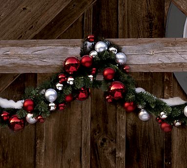 The dramatic garland is made to withstand the harshest weather. Faux pine is studded with sturdy red and silver plastic spheres that shine like metallic-finished glass.