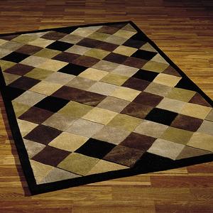 -quality Patches Rugs are luxuriously soft and plush under foot. Each rug is .75″ thick and hand-knotted in India from durable worsted wool. Fields are covered with rows of hi-lo sculpted diamonds in buff ivory, brown taupe, beige taupe, avocado, gray, and black; border is black.