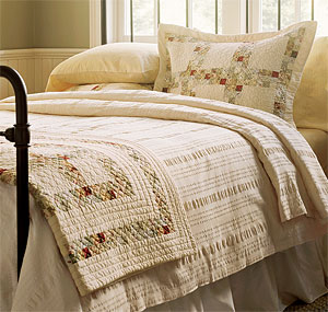 Hand crafted of thousands of tiny “postage-stamp” patches in charming pastels and antiqued prints, the vintage design of this pieced quilt is set against a creamy white ground with tonal stitching accent.