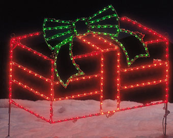 This charmingly festive Christmas light outdoor sculpture is a gift, wrapped in red paper with a green bow on top. This outdoor Christmas display piece stands 3 feet tall and features durable metal frame with attached red and green lights.