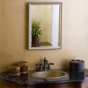 The mirrored door has a 1-inch bevel and is surrounded by a beautiful antique frame.Adjustable glass shelving inside sits in front of a mirrored back.