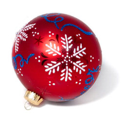 This remarkable ornament is a great addition to your Christmas tree. Animated white snowflakes and colorful blue ribbons decorate the surface of this glass ornament.