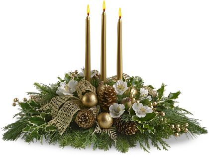 Create a regal setting for your Christmas celebration with this brilliant centerpiece of three tall golden tapers surrounded by fresh white blooms and fragrant evergreens, plus shimmering golden berries, pine cones, ornament balls and a fancy mesh ribbon!