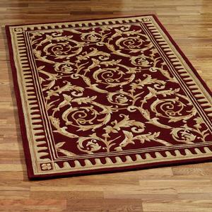 Make a statement with the luxurious feel of Rue Jones rugs proudly displayed in your home. Handmade in China of 100% wool, the floorcoverings have a burgundy field with golden acanthus leaf accents. Rugs are 5/8″ thick.