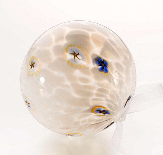 Sand dollars on a pearly white sand beach, in blown glass ornament.