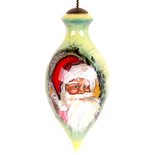 This blown glass ornament shows a wonderful Santa face against a pale green background. The ornaments are made of blown clear glass that have been hand painted on the inside.