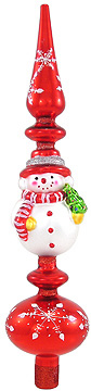 This happy snowman glass tree topper is proud to watch over your Christmas tree this year. Dazzling with sparkling snowflakes, this eye-catching red topper is crafted of glass with an opening in the base for your tree top.