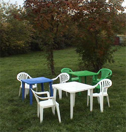 The use of delicate forged iron or welded steel structures is an interesting solution for the garden chairs, benches and tables. For corrosion protection and decoration, the metal covered with 1-2-mm layer of plastic. This furniture is very elegant, but expensive.