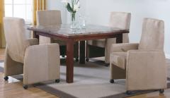 The upholstered, beige chairs are tailored to complement the clean lines of the square table, which features a stone top. The set is ery nice to have and you will be able to enjoy many family dinners or small dinner parties with another couple.