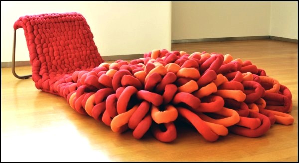 Loop Chair is made of 1000 feet “yarns”, consisting of thick soft strings of red and orange, which is wrapped around the metal mesh-frame that supports the shape of the chair. And topped with an unusual piece of furniture merry “fan” of dozens of loops: this is for foot rest, well, for decorative purposes, of course.