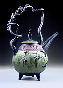 Wheel-thrown and handbuilt stoneware teapot decorated with a hand-pressed scale pattern. Green copper-ash glaze with black trim and red iron oxide detailing. Botanical specimens vary seasonally. Food and dishwasher safe.