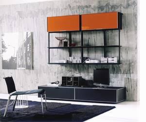 Sturdy wall-mounted storage unit. The frame and shelves are made from dark brown lacquered steel. The unit is available with 3 shelves, or with 2 shelves and a storage box (with lacquered glass door). The door can be lacquered dark brown, dove grey or orange glass.