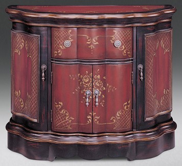 The inspired design boasts scalloped edges for lovely dimension. Floral and woven details are hand-painted for added eye appeal, and drawer-and-door storage opens to ample space.