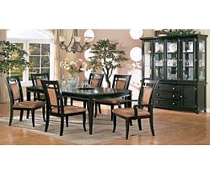 The dining set has seven pieces which includes one table, two arm chairs, and four side chairs all in a black expresso wood and crafted with suede seats and select hardwoods.