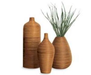 Every modern, serene, earth-toned room in your home your entry, den, bedroom or study can benefit from a little textural pleasure, brought to you by an ensemble of these rattan-wrapped vessels in three very contemporary shapes, all in rich ochre.