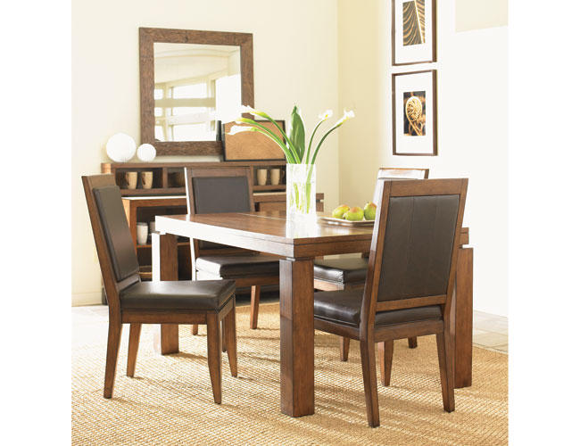 Contemporary styled sleek Up to Date Wood Dining Room Set crafted from select hardwoods and quartered oak veneers, and rendered in a warm medium brown finish.