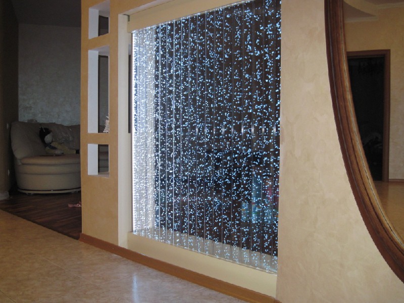 Glass waterfall is another original solution. In this case the water will be pouring over the glass. Fascinating is the fact that the water in this glass is reflected, which gives a magnificent view to the room interior.