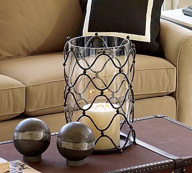 A traditional Moroccan tile pattern gives our hurricanes their graphic style. Hand forged of iron with a bronze finish, and fitted with a glass-hurricane insert.