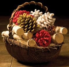 A charming way to keep your fire roaring, the Whistler Fire Cone Arrangement makes a great gift. These home accents are displayed in a dark bubble weave willow basket with rope trim, handle and raffia bow.
