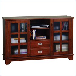 Each sliding door compartment features two shelves, while the center console has two open shelves and a pair of pull drawers with modern nickel cusp pulls. A cherry wood finish gives the Sliding Door Cabinet an inherent warmth, and thus completes its look and appeal
