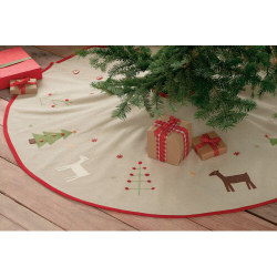 Put the finishing touch on your holiday decorations with the Woodland Christmas Tree Skirt. This charming tree skirt features applique and embroidered reindeer and Christmas trees with button details.