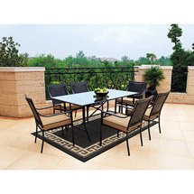 Enjoy dining outdoors with this stylish seven-piece set. It includes a sturdy glass and steel table and six cushioned chairs.