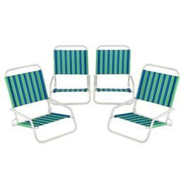 Soak Up the Sun and Relax with this Sand Chair Set • 4-pc. Set, Includes 4 Folding Sand Chairs • White Steel Frame with Powder-Coated Finish • Green, Blue 100% Polyester Fabric with Striped Pattern • Folding Design for Easy Storage