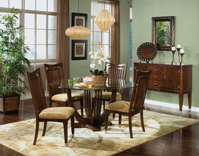 Everyone falls in love with this gorgeous dining room set! Quality features echo from every tight wood pore! Made with Italian leather, antiqued nail head’s, marbled solid wood with a scrumptious hazelnut cherry finish. The features on the beautifully designed china cabinet are stellar, strong, masculine lines, heavy weight hardware on the handles and hinges. […]